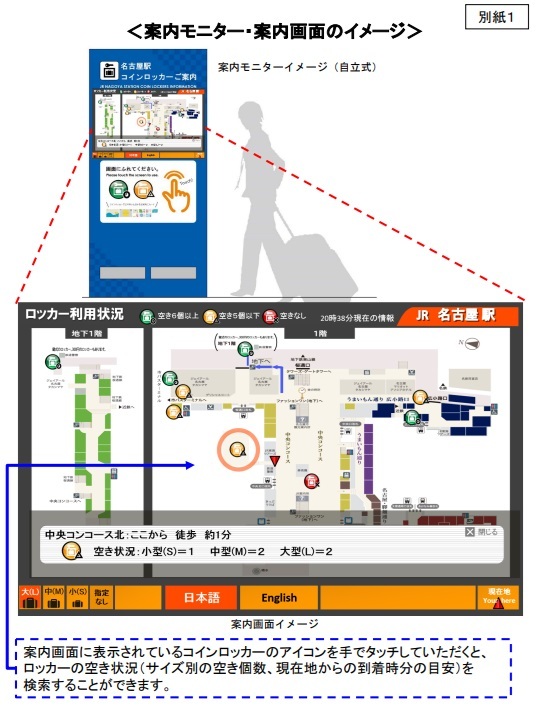 このたび、名古屋駅において、お客様の利便性向上を目的とし、「コインロッカー空き状 況案内システム(以下、案内システム)」を、東海地区で初めて導入します。